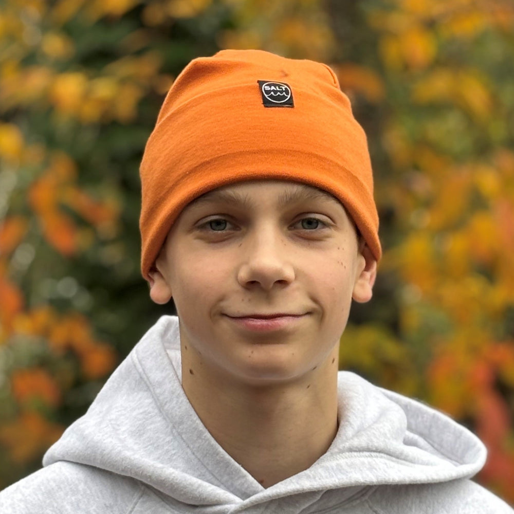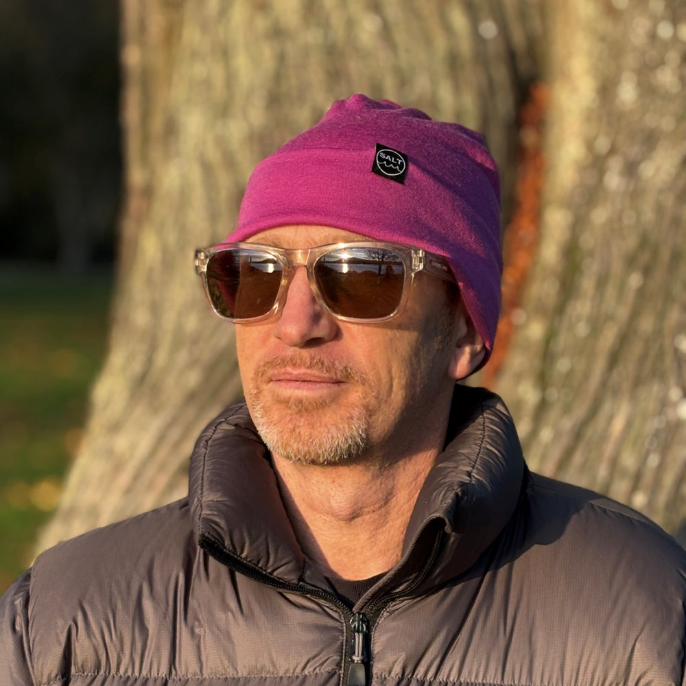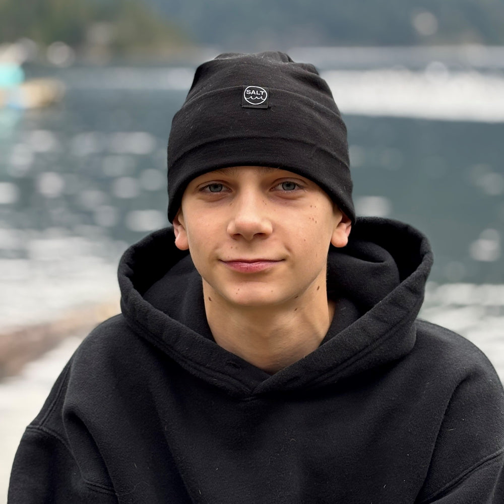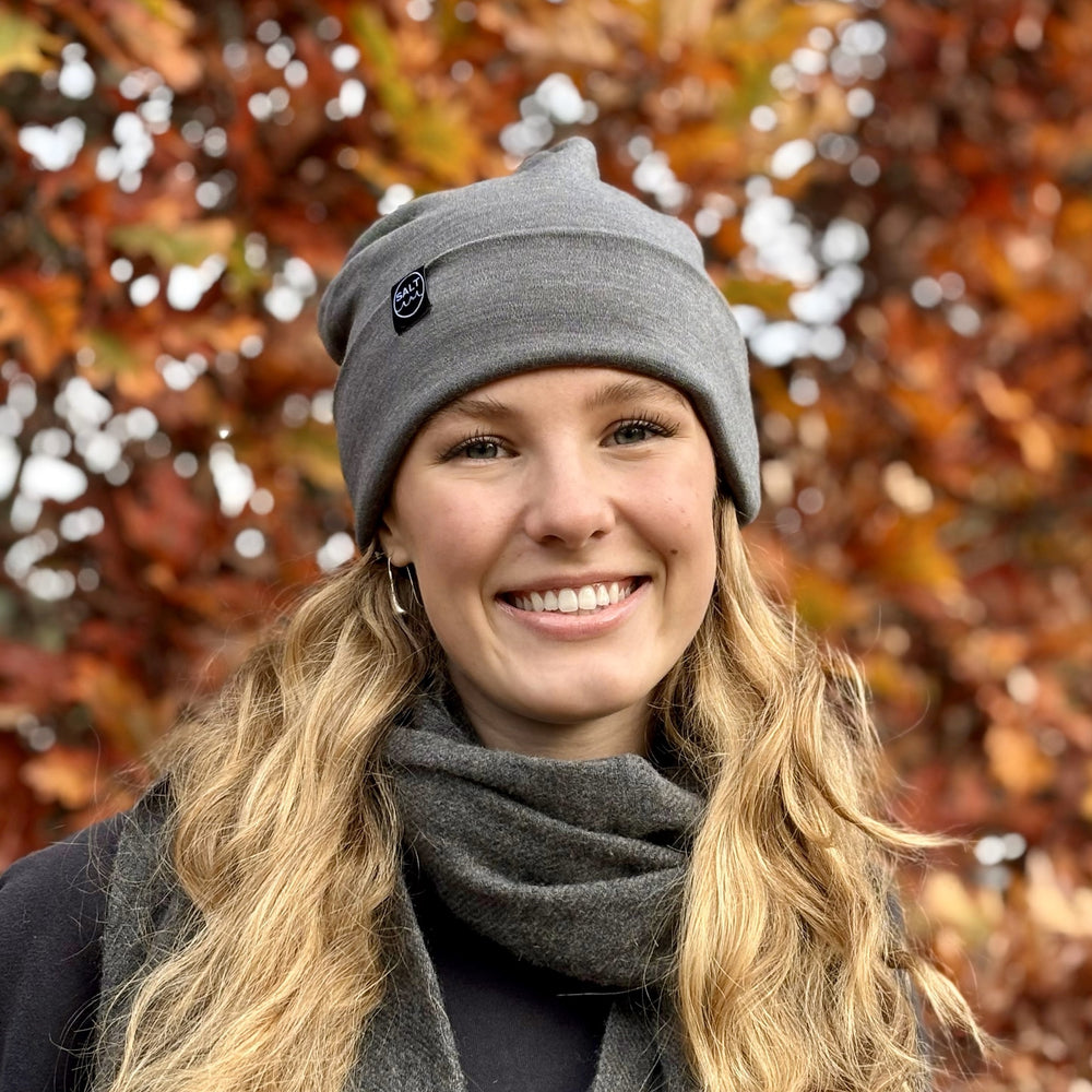 Made from 100% merino wool, these hats are bound to become your new go-to. Breathable and sustainable, they keep you warm without the itch or tightness of other materials. Lightweight yet super toasty, these hats dry quickly and stay fresh for longer. They can absorb up to 30% of their weight in water without feeling damp. Once you try merino, you’ll never look back. Available in a range of colours to match with your Salt change robe. Plus, the cuff can be worn up or down for versatile style.